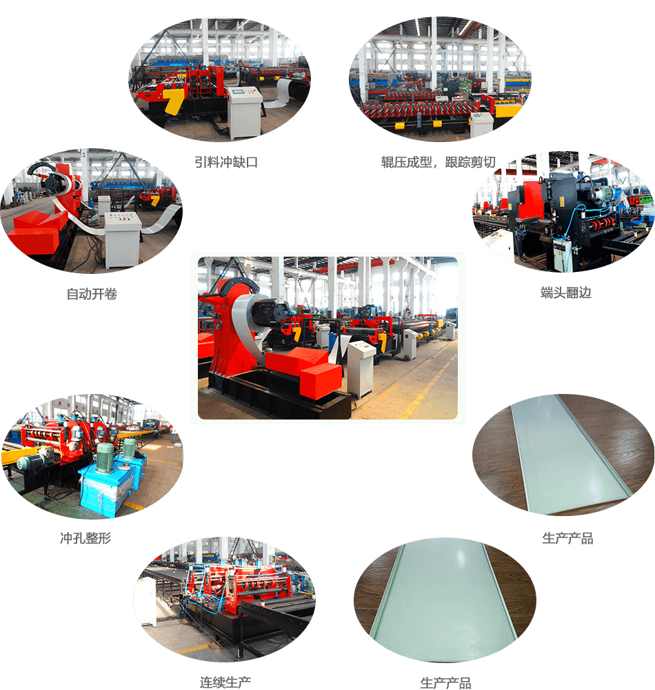 自動開卷→引料、沖缺口,剪切→輥壓成型、跟蹤切斷→動力輸送→前后端翻邊→沖孔整形