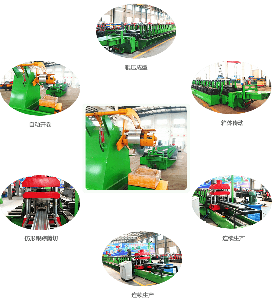 液壓自動開卷→引料裝置→校平→輥壓成型→機械跟蹤沖孔切斷→托料出板